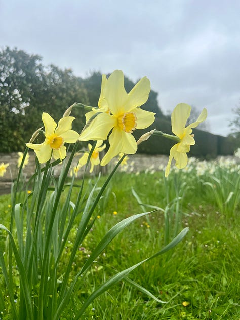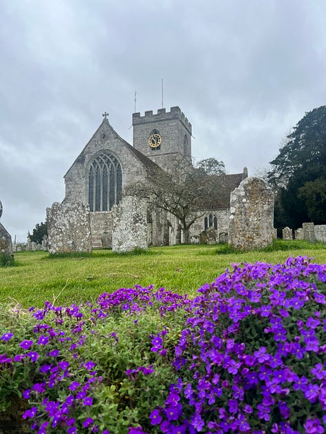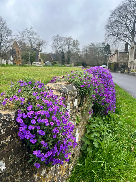 I stopped several times to take photos, but eventually drove on and found St Mary’s Church. It was in a lovely setting with lots of space around it and an old stone retaining wall with purple aubrietia spilling over it in places. I parked up and had a wander around the churchyard in the hope of spotting a grave surrounded by a ‘Host of Golden Daffodils’, but sadly, no one has thought to mark the Vicar’s final resting place in what would have been a most appropriate way. So I didn’t spot his grave.